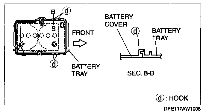 3. Install with battery cover hooks D aligned with the battery tray flange at four points.