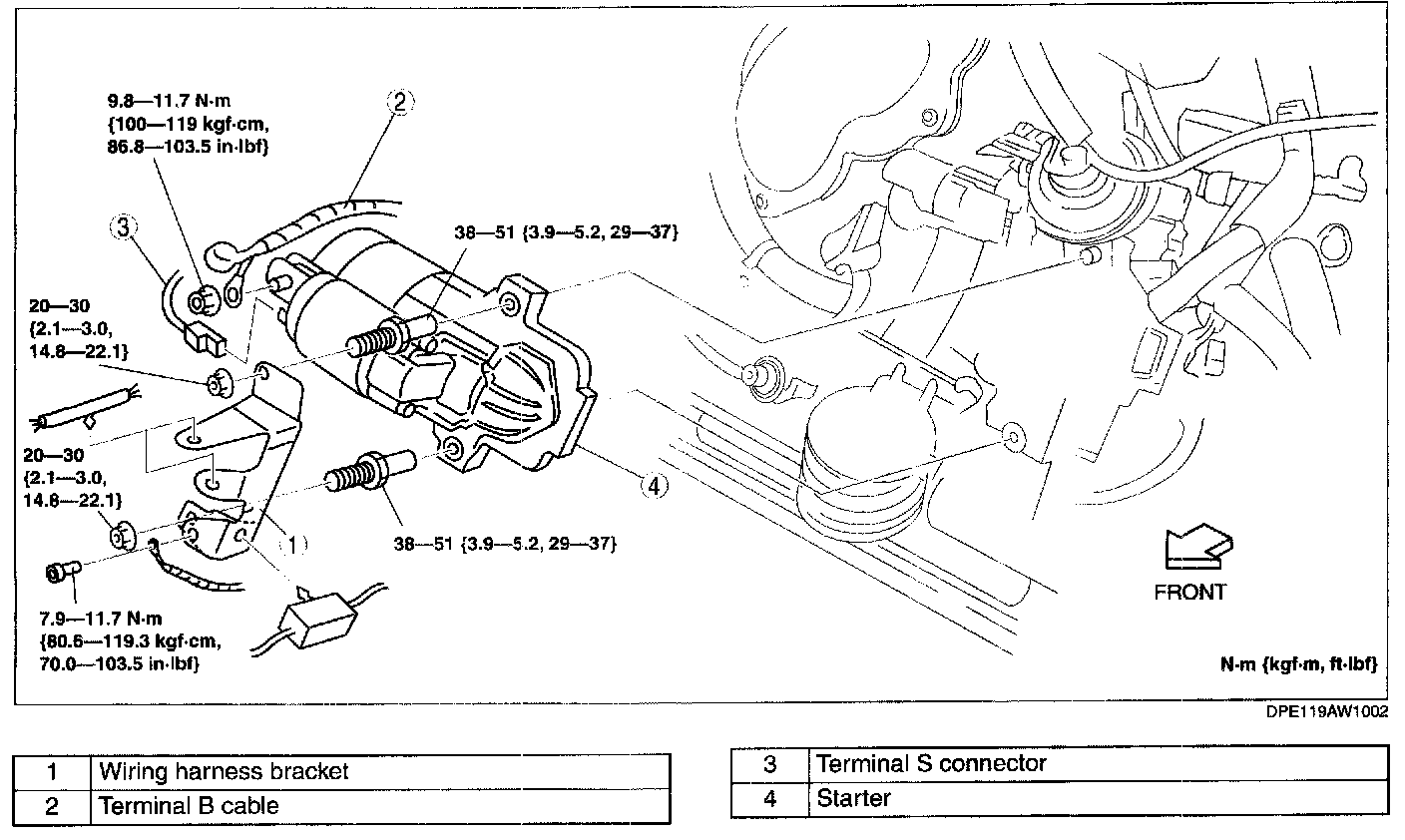 - When the battery cables are connected, touching the vehicle body with starter terminal B will generate sparks. This can cause personal injury, fire, and damage to the electrical components. Always disconnect the negative battery cable before performing the following operation.