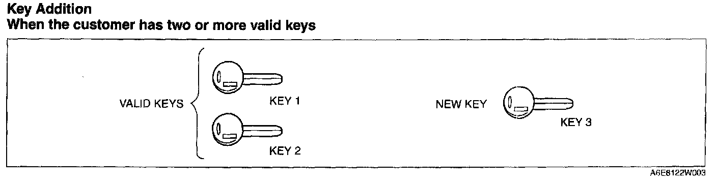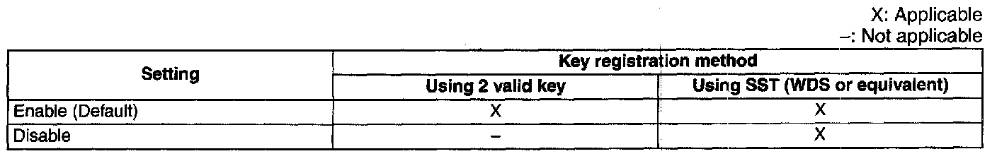 NOTE: With this function, enabling and disabling of the "When the customer has two or more valid keys" function can be set using the SST (WDS or equivalent). This function is provided to prohibit drivers from performing the reprogram procedure on vehicles owned by rental car companies or other large vehicle fleet owners.