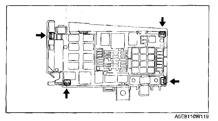 1. Press and remove the tabs on the main fuse block at the positions indicated by the arrows.