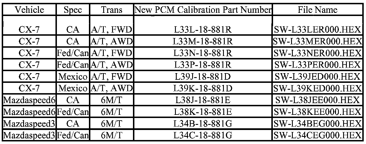 The PCM Calibration Part Numbers listed above are provided for PCM reprogramming purposes only. These are not necessarily the same Mazda part numbers used to order an actual PCM through the Mazda Parts System. It is not necessary to order a PCM as part of this repair procedure.