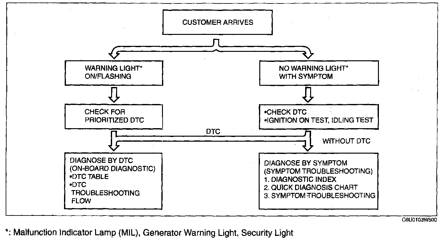 FOREWORD [L3]When the customer reports a vehicle malfunction, check the malfunction indicator lamp (MIL) indication and diagnostic trouble code (DTC), then diagnose the malfunction according to following flowchart.