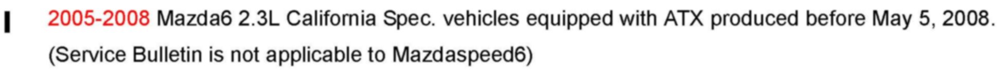 NOTE: This service bulletin ONLY applies to California specification vehicles equipped with automatic transmission. This service bulletin does not apply to Mazdaspeed6 vehicles.