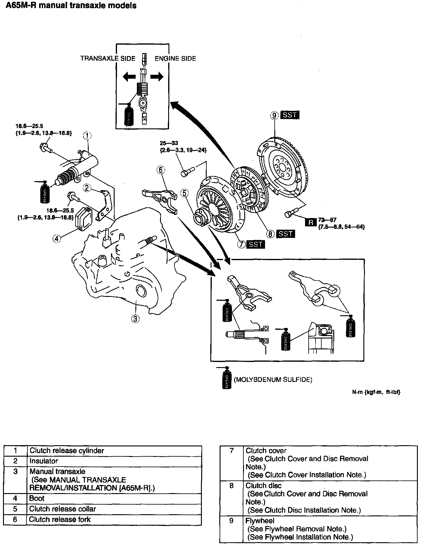 A65M-R manual transaxle models 73 - 87 Nm (7.5 - 8.8 kgf.m, 54 - 64 ft. lbs.)