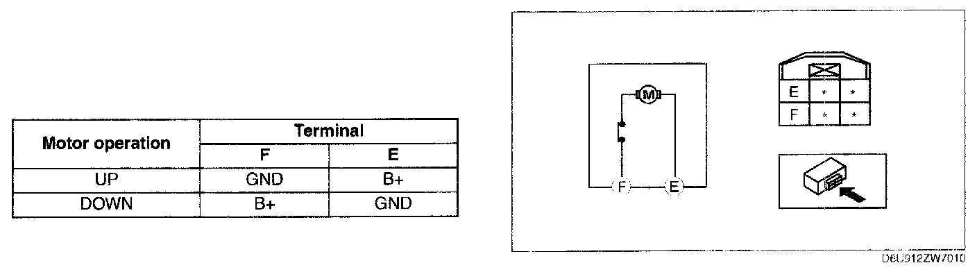 2. Apply battery positive voltage to the power window motor terminals E and F and inspect the operation the power window motor operation.