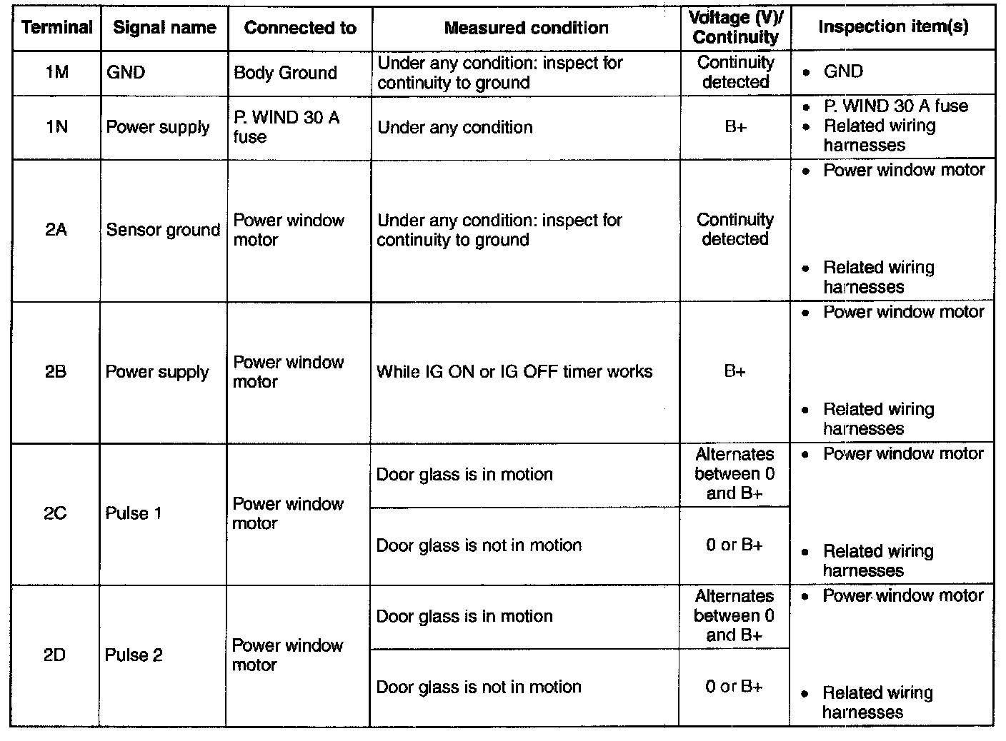 POWER WINDOW MAIN SWITCH INSPECTIONNOTE: Before proceeding with diagnosis of malfunctioning power windows, ensure the POWER WINDOW INITIALIZATION PROCEDURE has been performed.