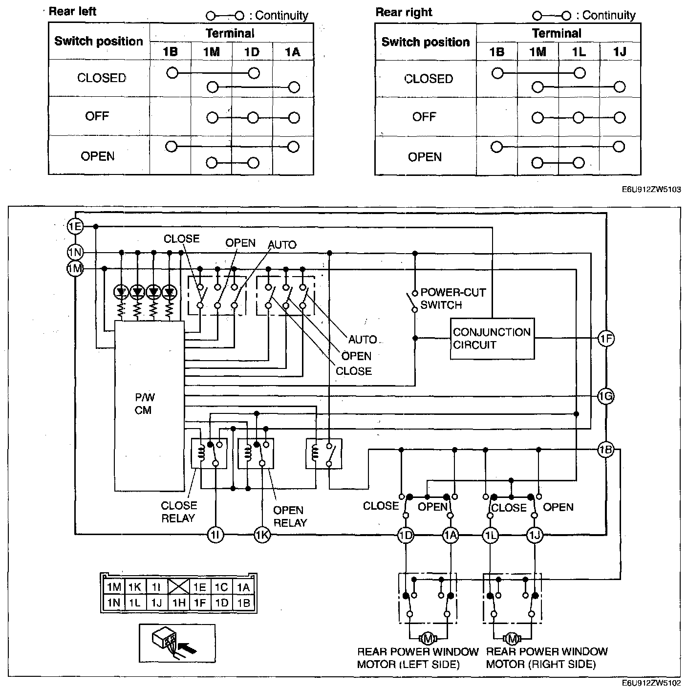 3. Inspect the power window main switch connector for continuity at terminal 1 M and 2A.