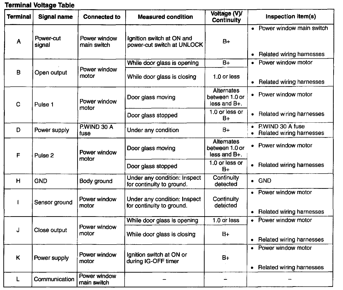 Terminal Voltage Table - Terminals (A - L):