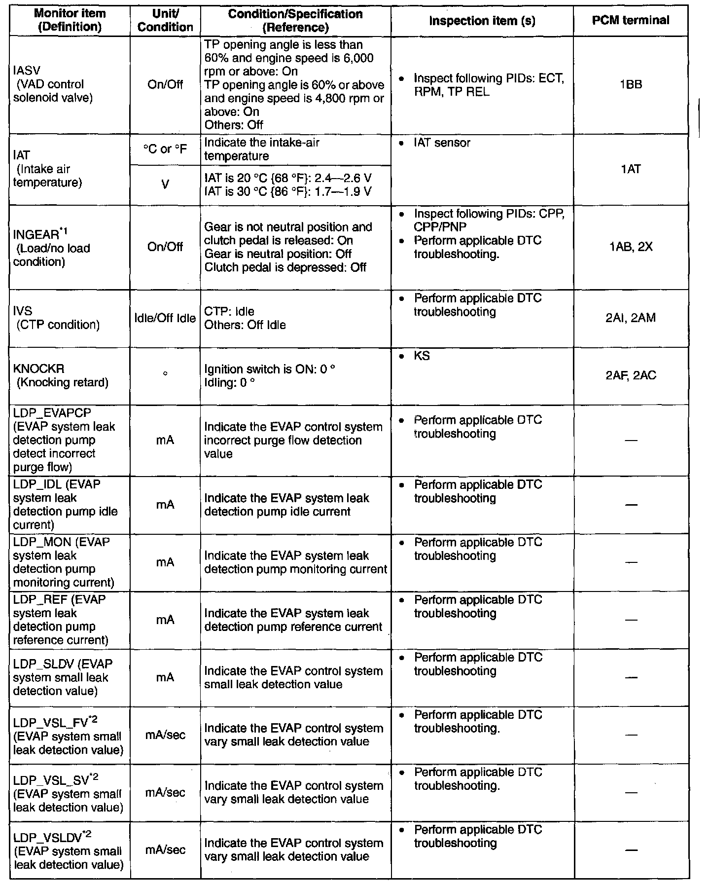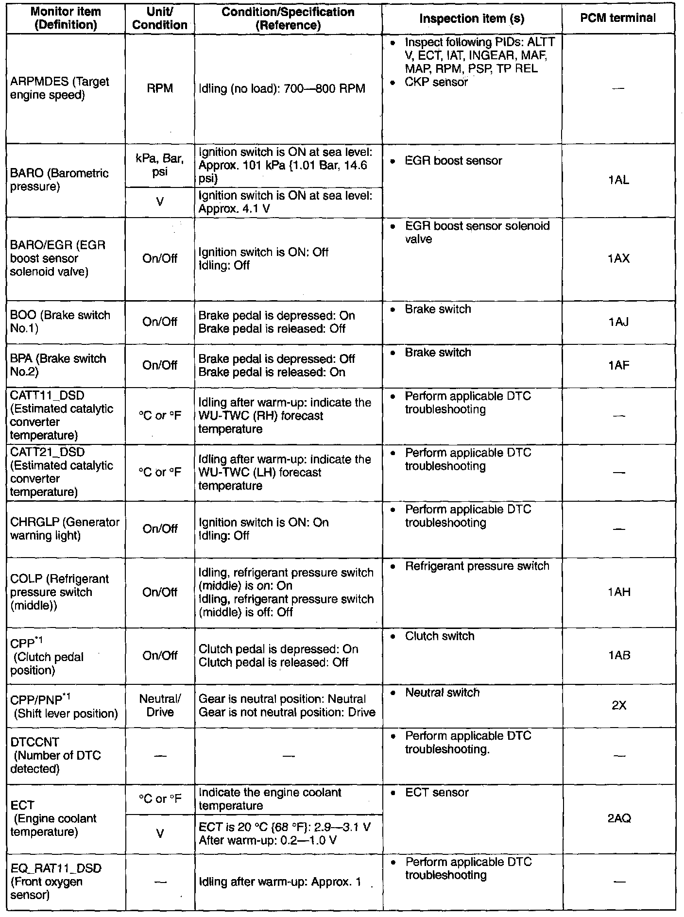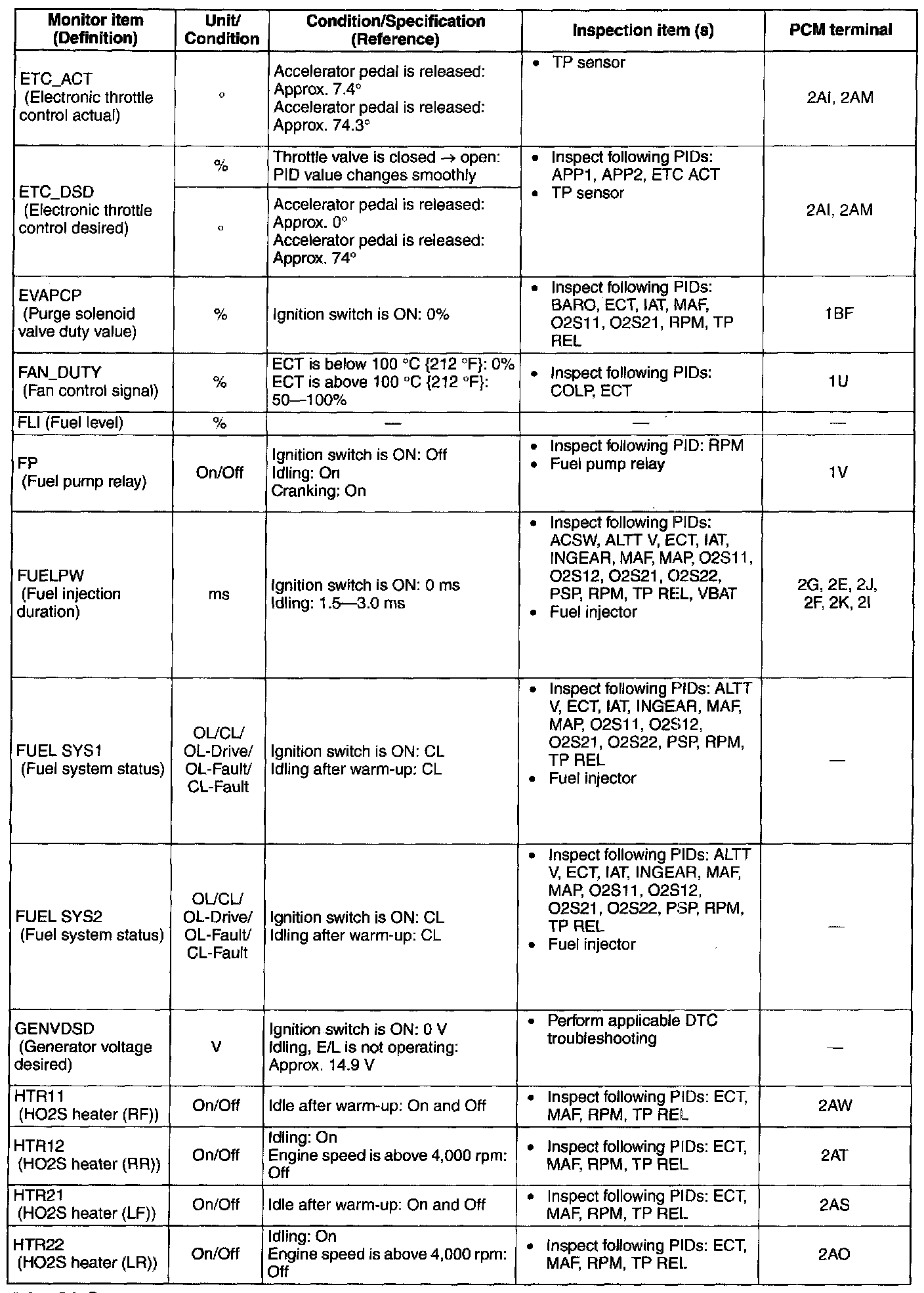 PID/DATA Monitor Table (Reference)