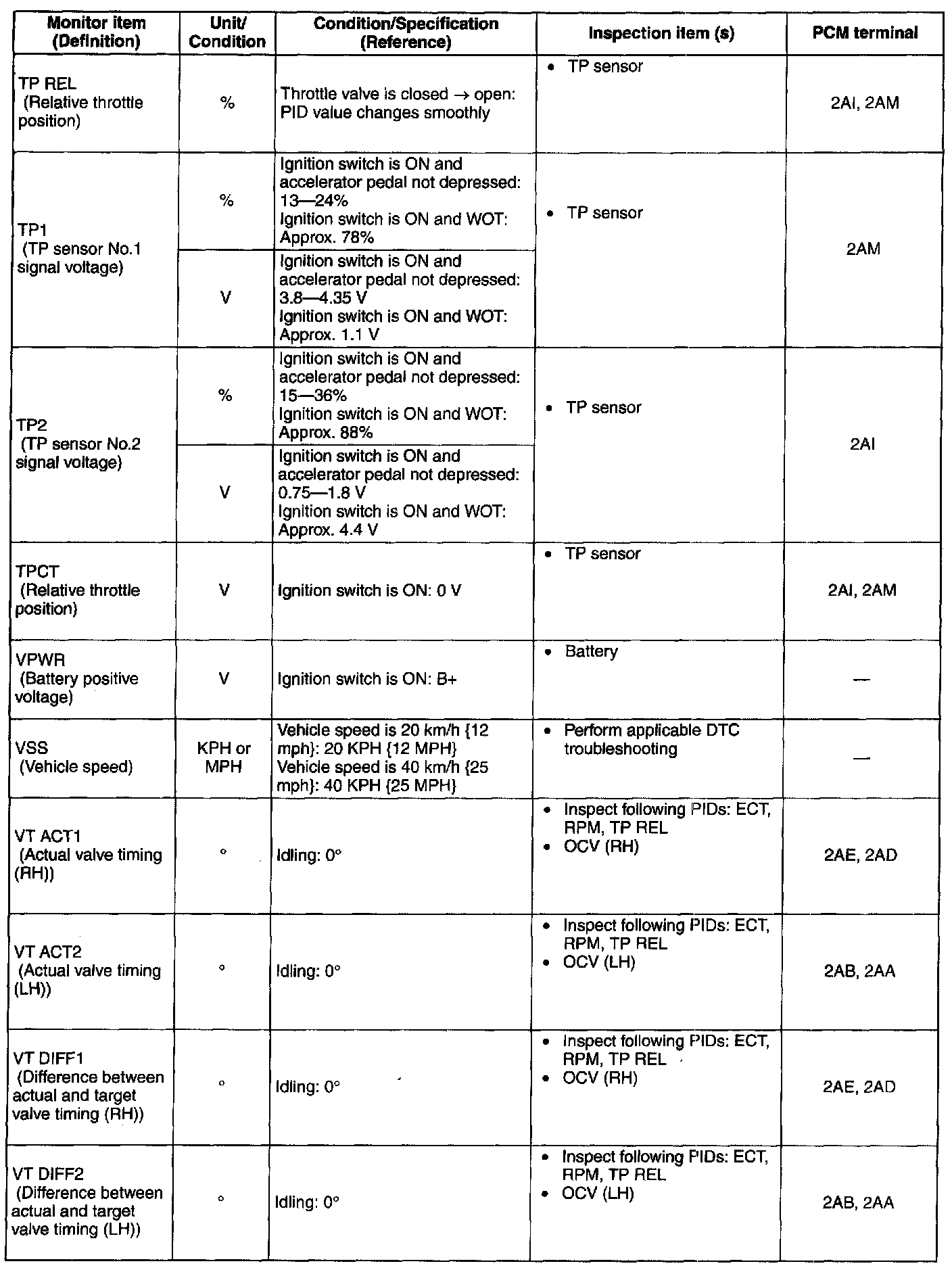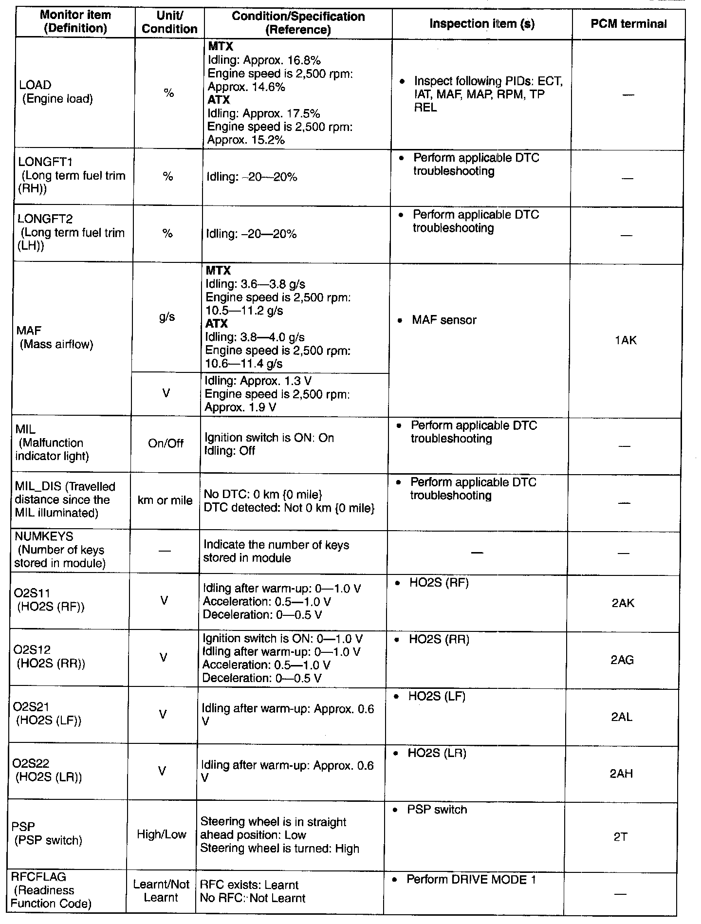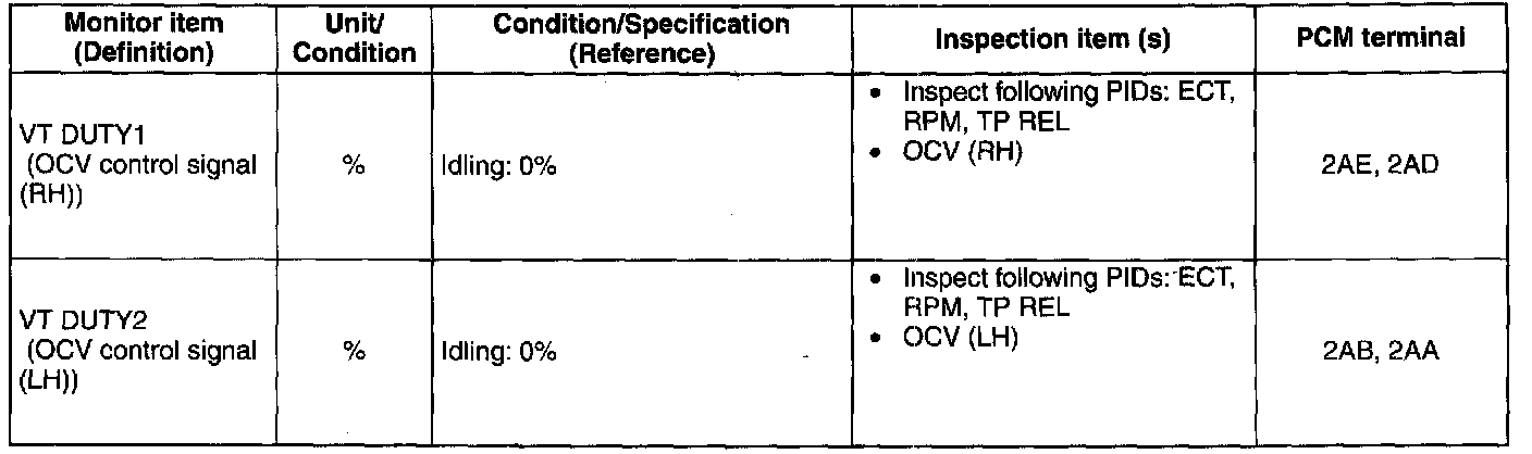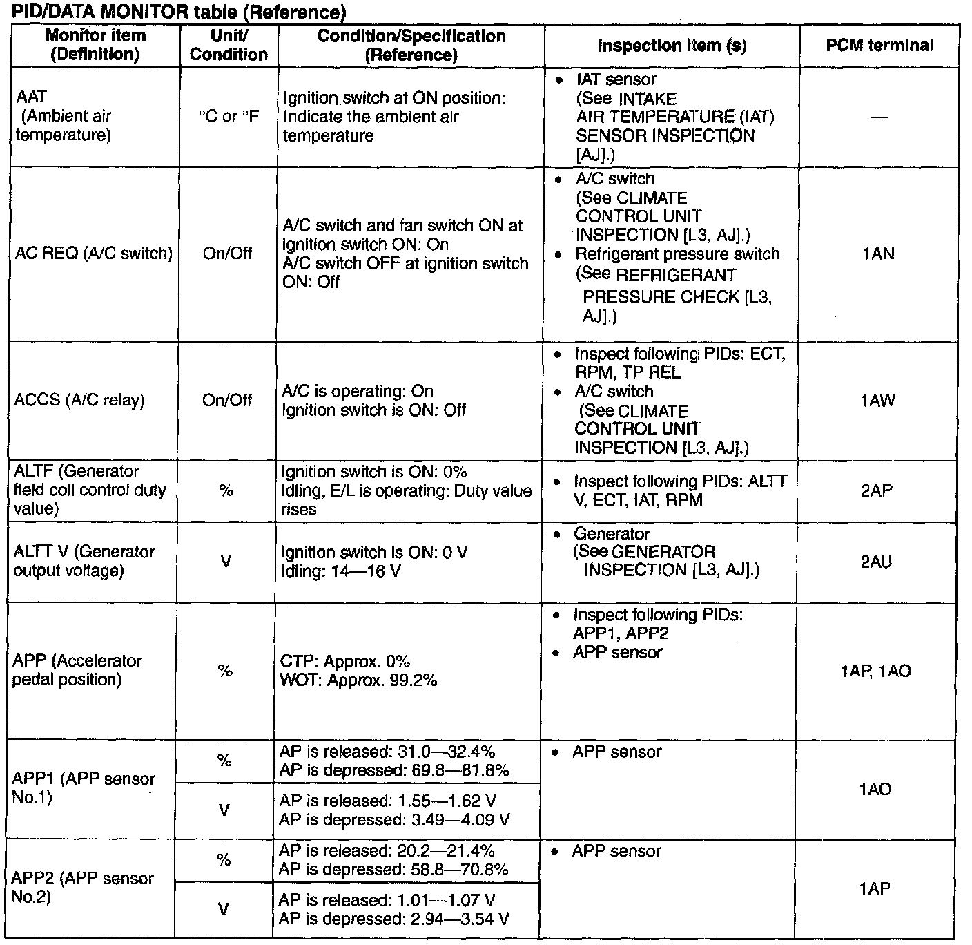 PID/DATA Monitor Table (Reference)