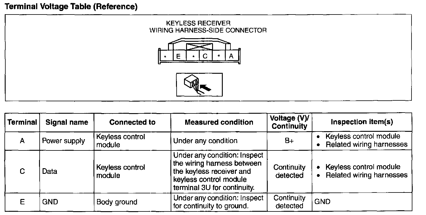 KEYLESS RECEIVER INSPECTION [WITH ADVANCED KEYLESS SYSTEM]Terminal Voltage Table (Reference):