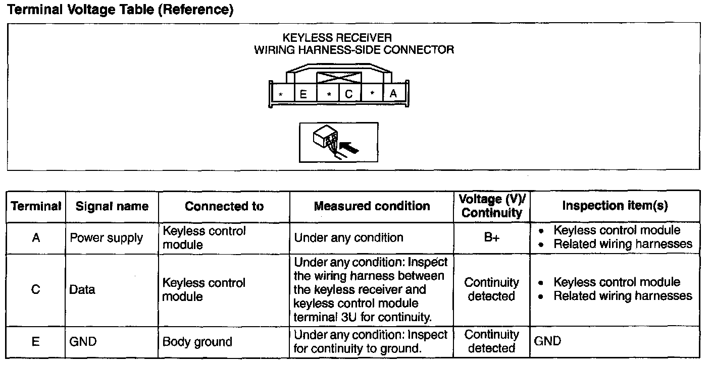KEYLESS RECEIVER INSPECTION [WITH KEYLESS ENTRY SYSTEM]Terminal Voltage Table (Reference):