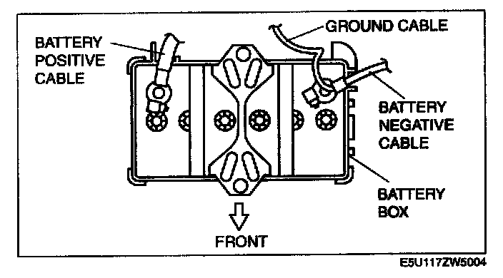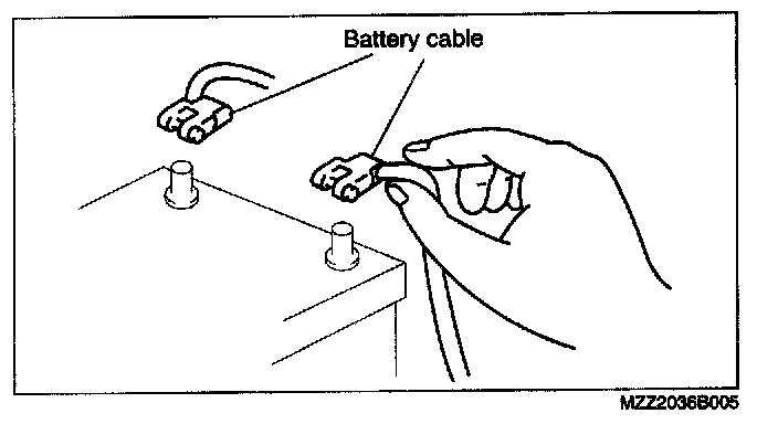 NOTE: When connecting the negative battery cable to the battery, connect the negative battery cable and the ground cable as shown in the figure.