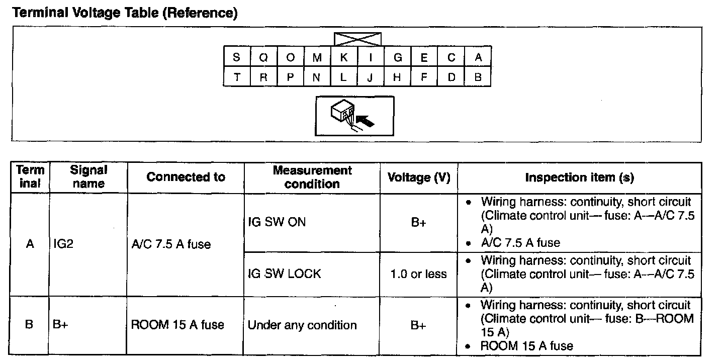 3. By inserting the positive (+) lead of the tester into each climate control unit terminal, measure the voltage according to the terminal voltage table.