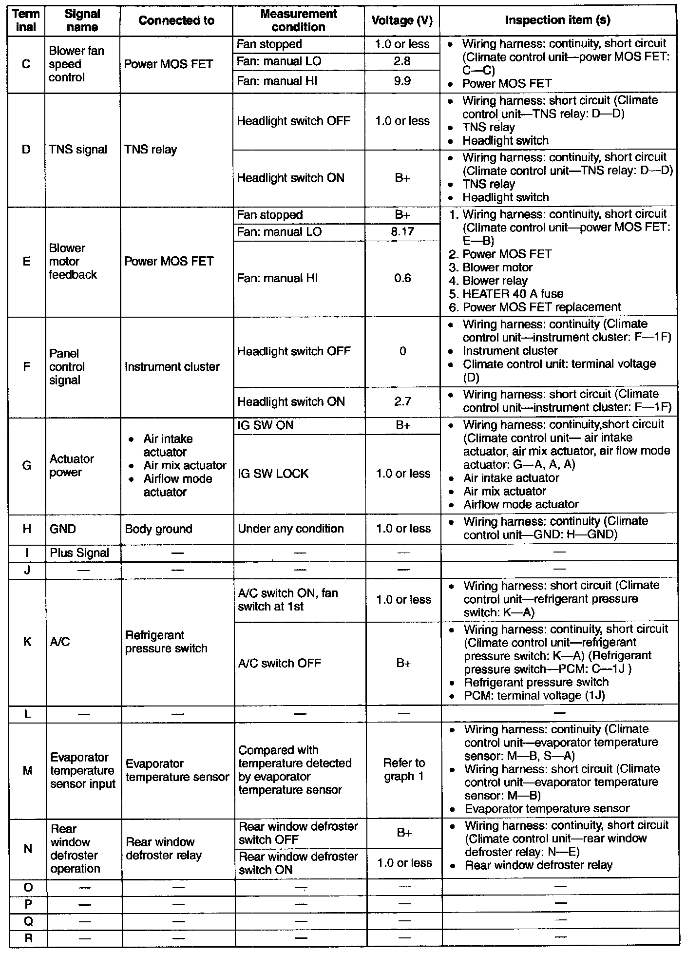 - If the parts under "Inspection item (s)" are found to be normal, replace the climate control unit.