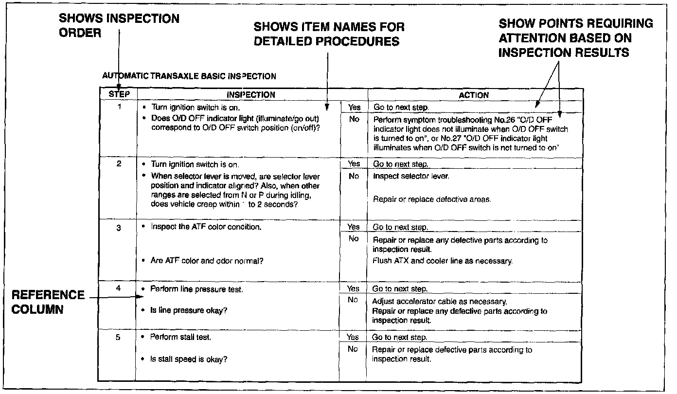 - Although inspections and adjustments are performed according to the reference column procedures, if the cause of the malfunction is discovered during basic inspection, continue the procedures as indicated in the action column.
