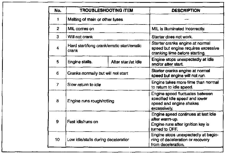 - The appropriate diagnostic inspection relating to malfunction cause as specified by the symptoms can be selected by looking down the diagnostic inspection column of the chart.