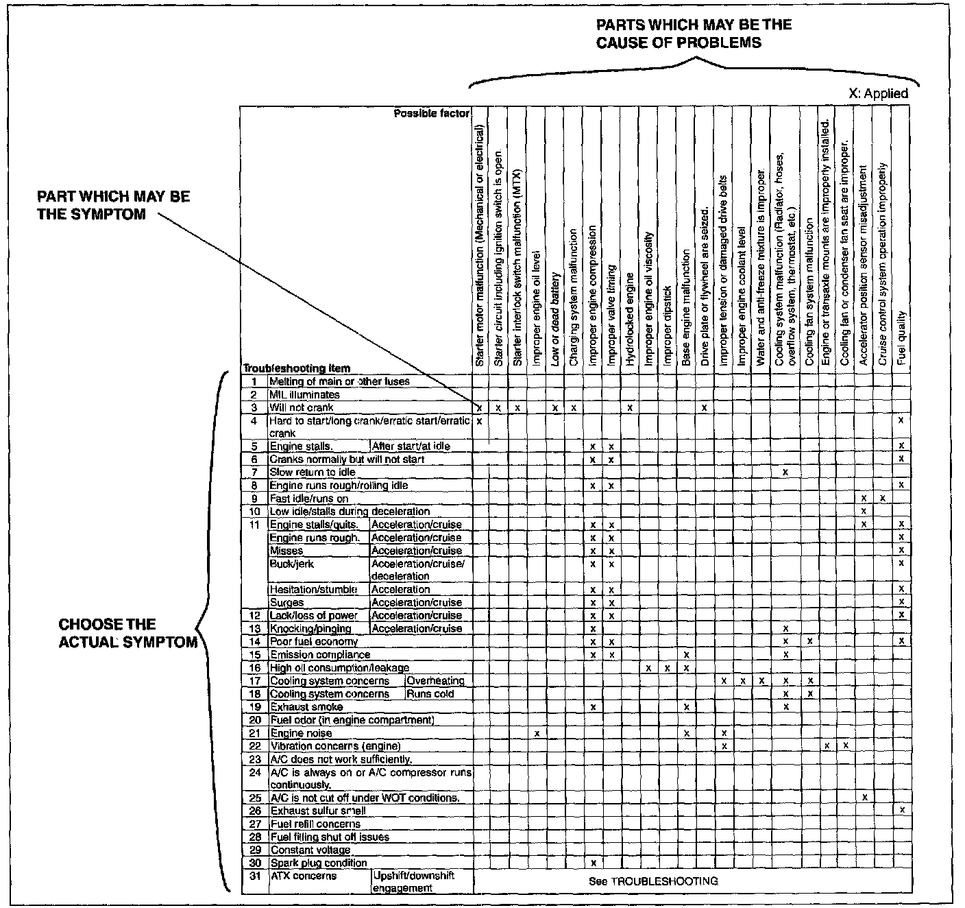 - The chart is effective in quickly narrowing down the relation between symptom and cause of the malfunction. It also specifies the area of the common cause when multiple malfunction symptoms occur.