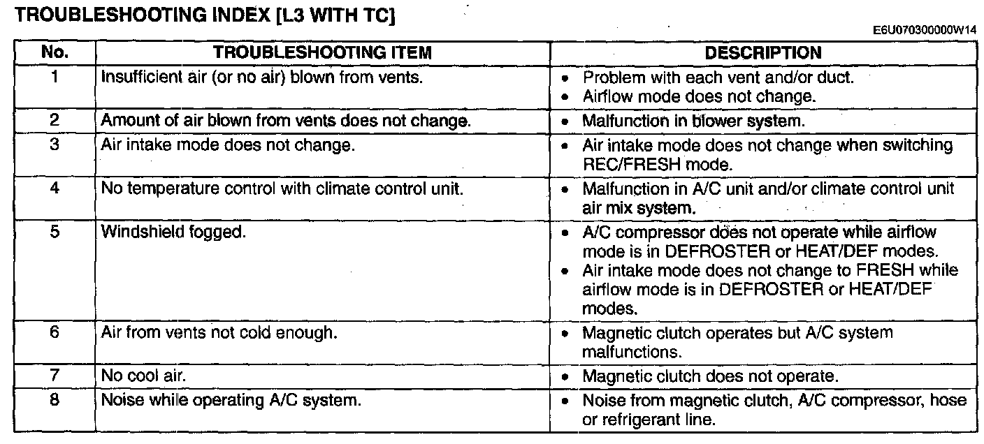 - The areas for inspection (steps) are given according to various circuit malfunctions. Use the above chart to verify the symptoms of the trouble in order to diagnose the appropriate area.