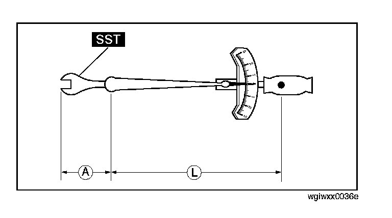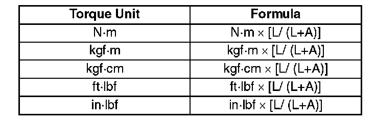 ^ When using a torque wrench-SST or equivalent combination, the written torque must be recalculated due to the extra length that the SST or equivalent adds to the torque wrench. Recalculate the torque by using the following formulas. Choose the formula that applies to you.