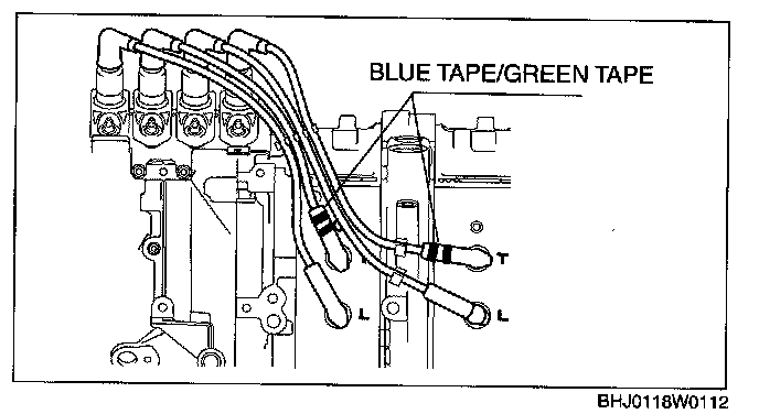 CAUTION: Install the high-tension lead with blue and green tape on the trailing side.