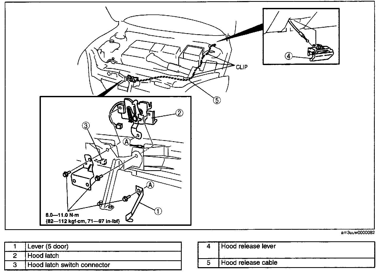 HOOD LATCH AND RELEASE LEVER REMOVAL/INSTALLATION1. To remove the hood release cable, remove the following parts.