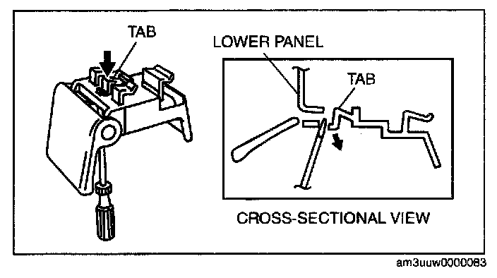 2. While pushing the tab in the direction of the arrow using a tape-wrapped, small flathead screwdriver, detach it from the lower panel.