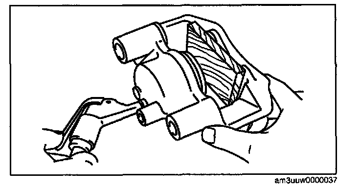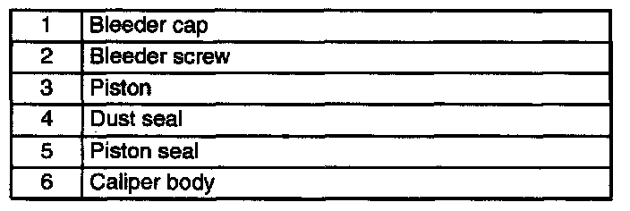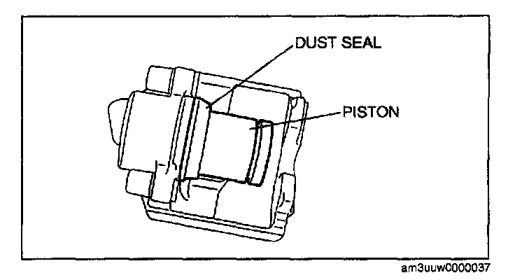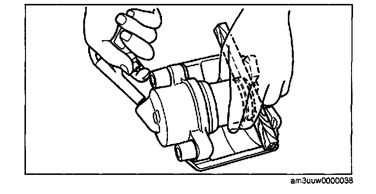 Warning: When compressed air is blown into the caliper body, injury to a finger or other part from pinching could result from the piston springing up. When blowing in compressed air, do not place your fingers between the piston and caliper body when performing the work.