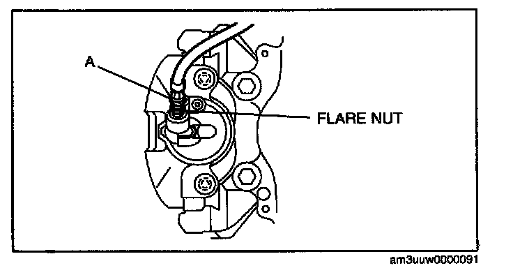 2. Tighten the flare nut while holding the brake hose at point A with a spanner or equivalent.