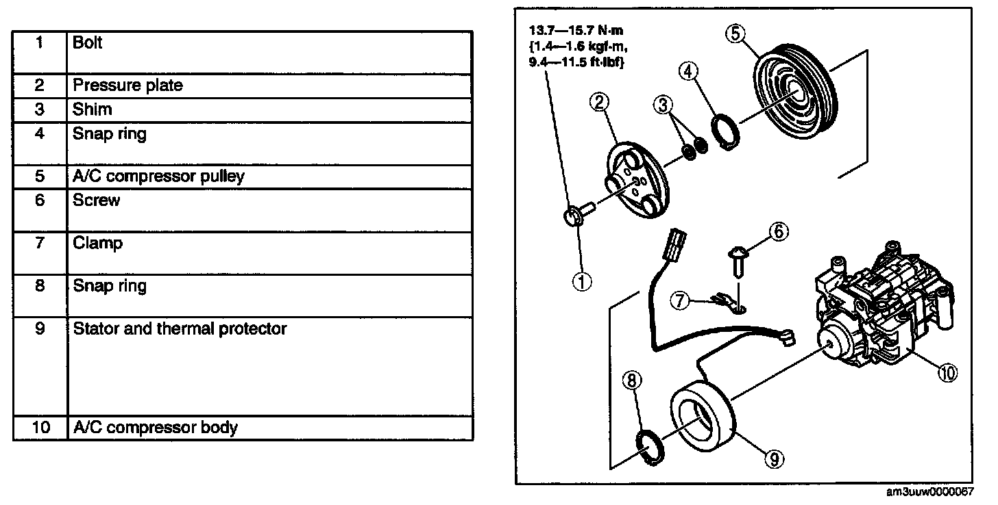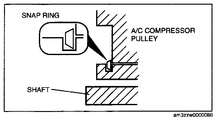 1. When installing a new pressure plate, A/C compressor pulley, stator, or A/C compressor body, replace the snap ring.