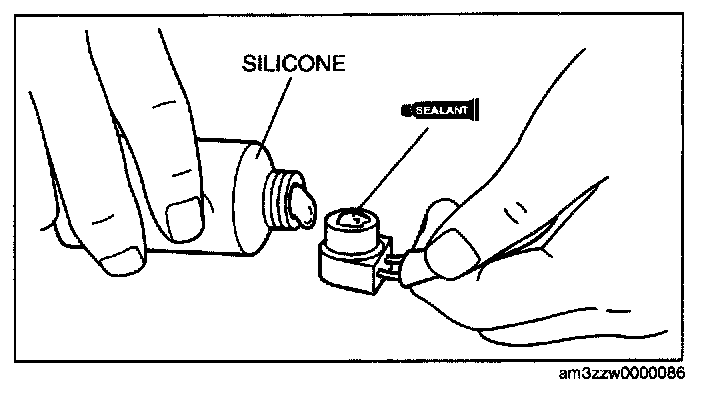 1. Apply approx. 1 g (0.04 oz) of silicone (Shin-Etsu Silicone KE-347W or similar) to the contact surface of the thermal protector, then thoroughly install it onto the A/C compressor, leaving no gaps.
