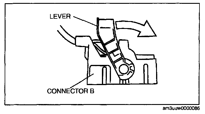 1. Rotate the lever in the direction of the arrow and remove connector B.