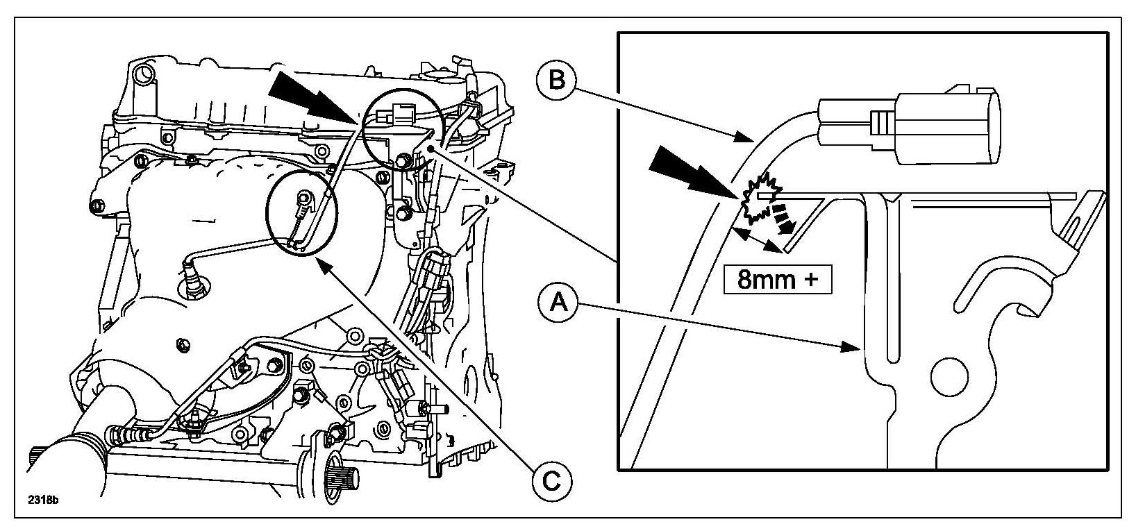 4. Using the pliers, bend the bracket (A) to make the clearance between the harness (B) and the edge of the bracket 8mm or more.
