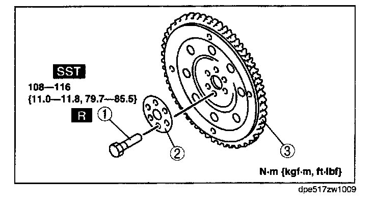 Tightening torque 108 - 116 N-m (11.0 - 11.8 kgf-m, 79.7 - 85.5 ft-lbf)