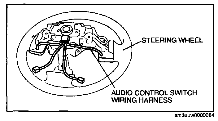 1. Install the audio control switch so that the audio control switch wiring harness passes behind the steering wheel as shown in the figure.
