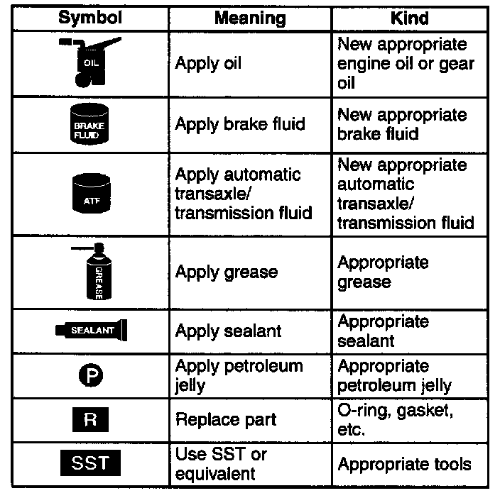 , sealant, and the use of SST or equivalent. These symbols show application points or use of these materials during service.