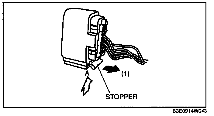 3. Pull the stopper of the front door lock actuator connector in the direction of the arrow (1).