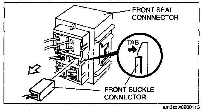 4. Detach the tab as shown in the figure and remove the connector from the front seat connector.
