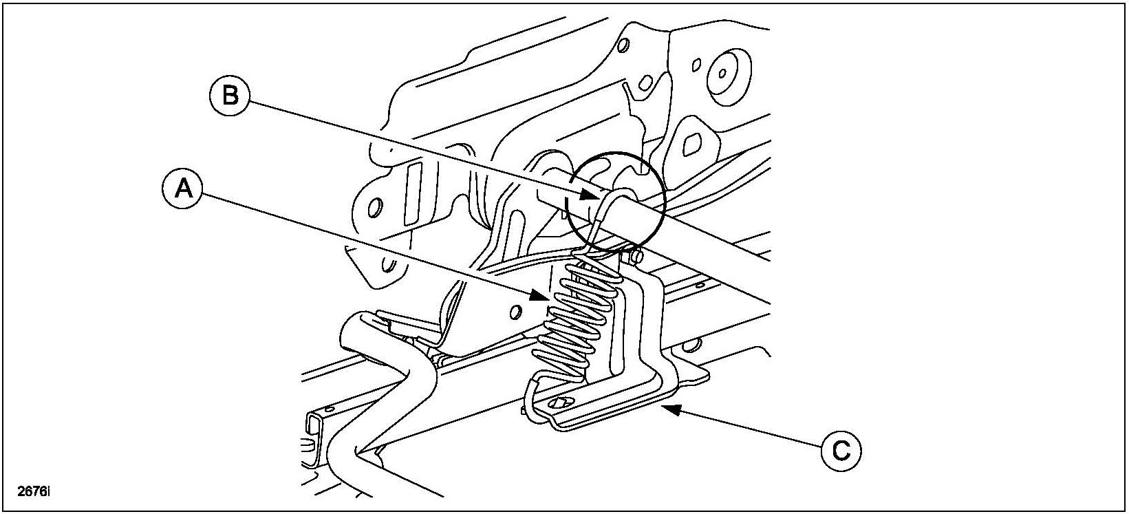 ^ Hook the spring (A) onto the seat stabilizer first (B), then onto the spring bracket (C).