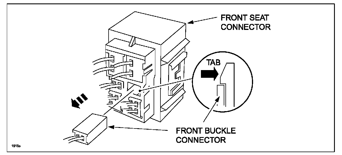 3. Disconnect the seat belt switch connector from the front seat connector by detaching the tab as shown. If necessary, follow the wire harness from the seatbelt buckle.