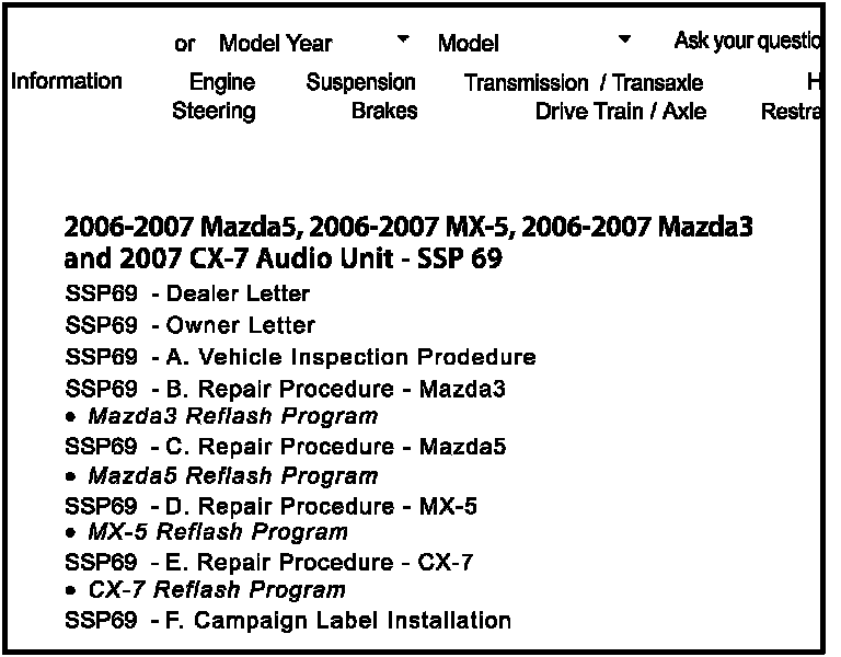4. When the SSP / Recall page opens, locate "2006-2007 Mazda5, 2006-2007 MX-5, 2006-2007 Mazda3 and 2007 CX-7 Audio Unit - SSP 69." This includes the PDF files for the SSP Instructions as well as the reflash software and any support documentation.