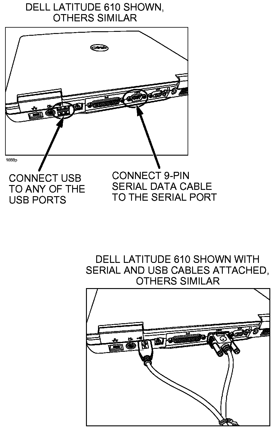 2. Connect 9-pin serial data cable and USB cable from flashing device to ports located on rear of computer (Dell Latitude 610 laptop shown, others similar).