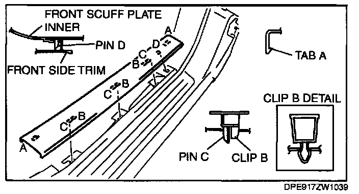 1. Pull the front scuff plate inner upward while detaching tabs A, detach clips B, pins C and D from the body, and then remove the front scuff plate inner.