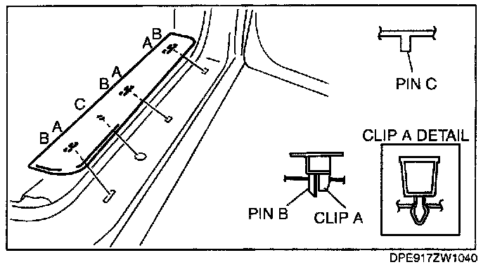 1. Pull the front scuff plate outer upward, detach clips A, pins B and C from the body, and then remove the front scuff plate outer.
