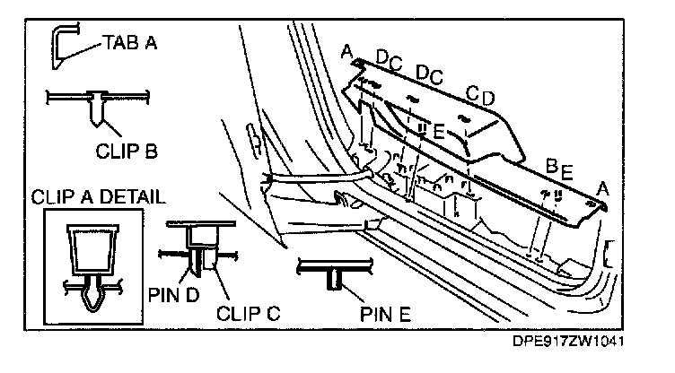 REAR SCUFF PLATE REMOVAL/INSTALLATION1. Pull the rear scuff plate upward while detaching tabs A, detach clips B and C, and pin D and E from the body, and then remove the rear scuff plate.