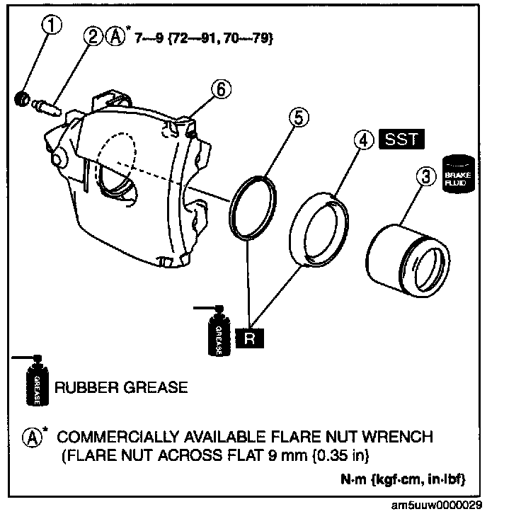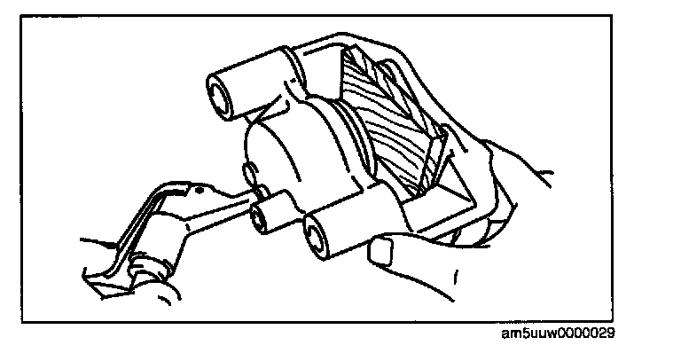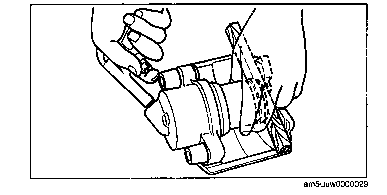 ^ When blowing compressed air into the caliper body, the piston may pop out and cause injury if not supported at the correct point. Securely support the piston friction surface by hand when blowing compressed air.