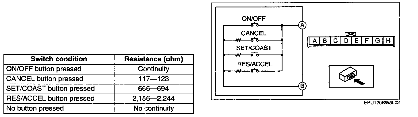 5. Inspect for resistance and continuity between cruise control switch terminals A - B using a tester.