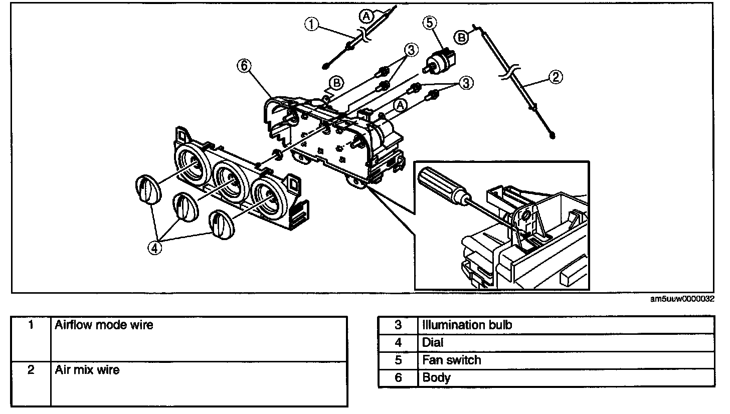 CLIMATE CONTROL UNIT DISASSEMBLY/ASSEMBLY[MANUAL AIR CONDITIONER]1. Set the airflow mode selector dial at defroster position.