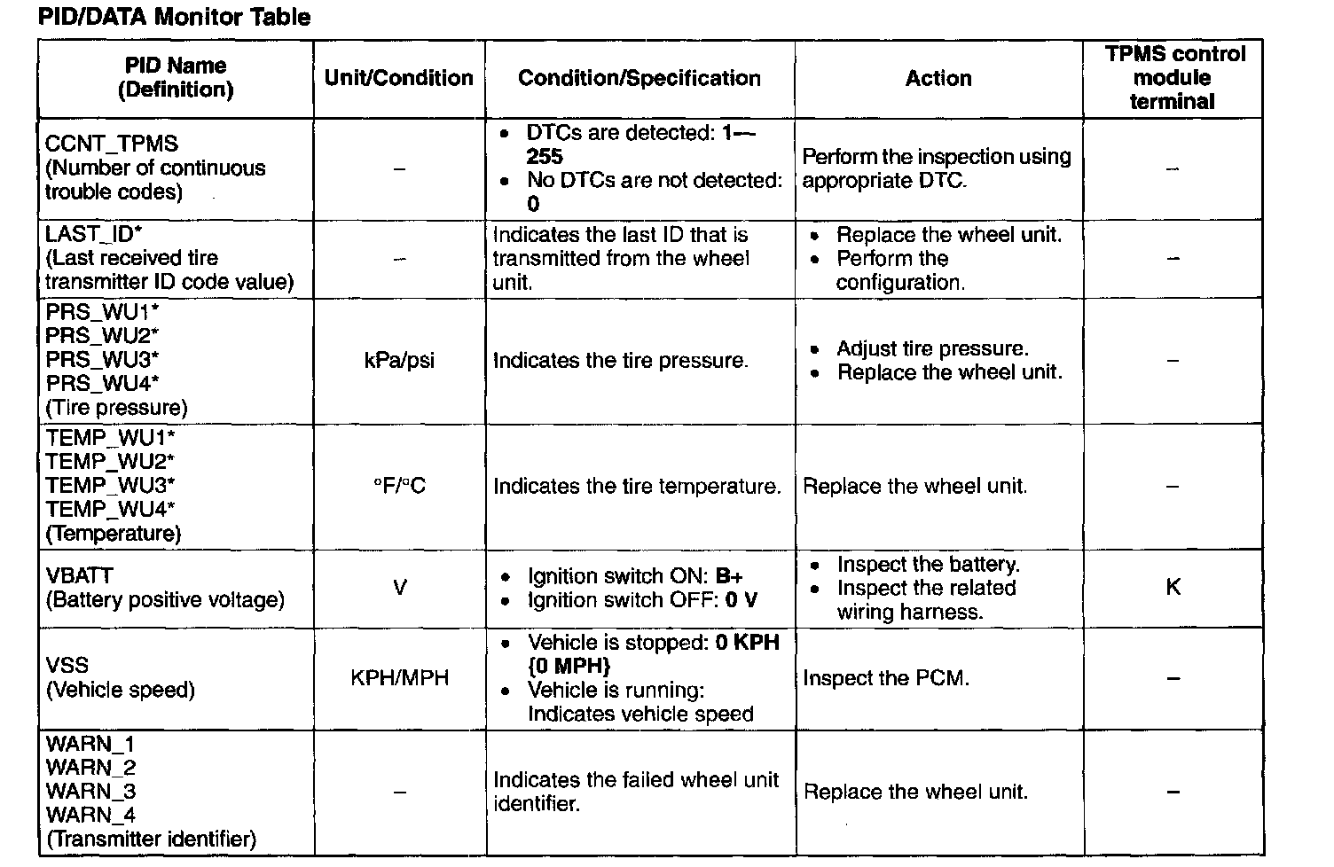 PID/DATA Monitor Table