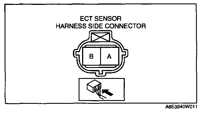 3. Place the ECT sensor in the water and while increasing the water temperature, measure the resistance between ECT sensor terminals A and B.
